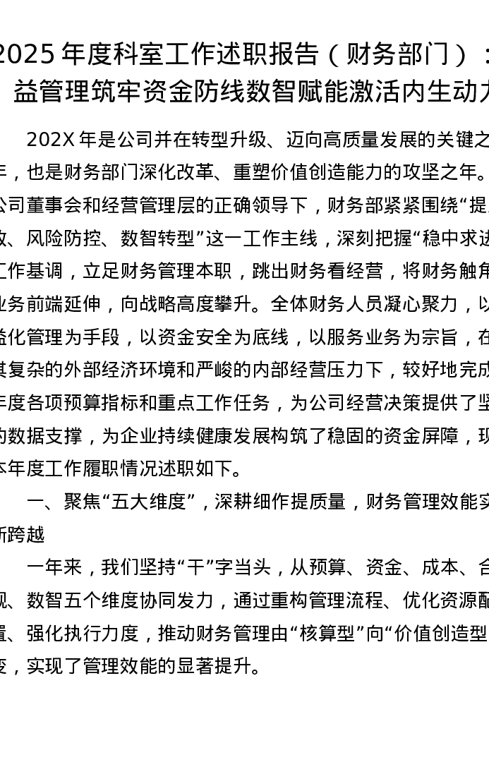 2025年度科室工作述职报告(财务部门):精益管理筑牢资金防线 数智赋能激活内生动力