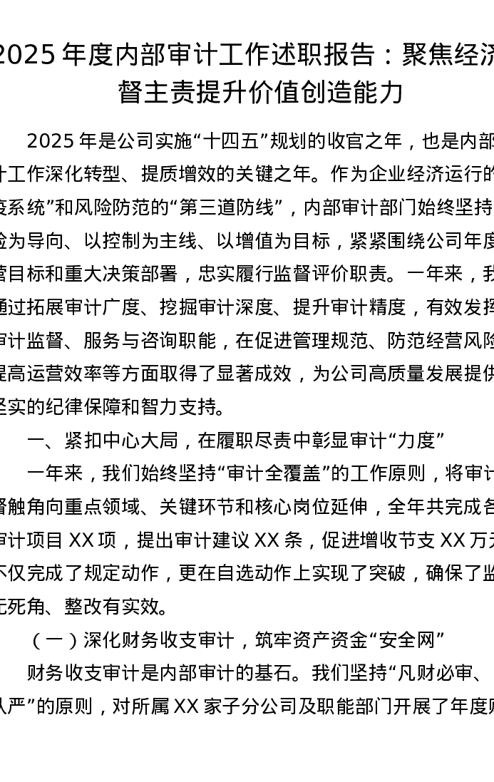 2025年度内部审计工作述职报告:聚焦经济监督主责 提升价值创造能力