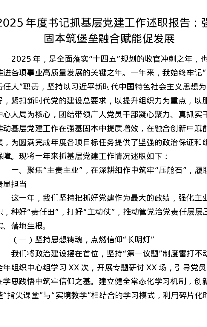 2025年度书记抓基层党建工作述职报告:强基固本筑堡垒 融合赋能促发展