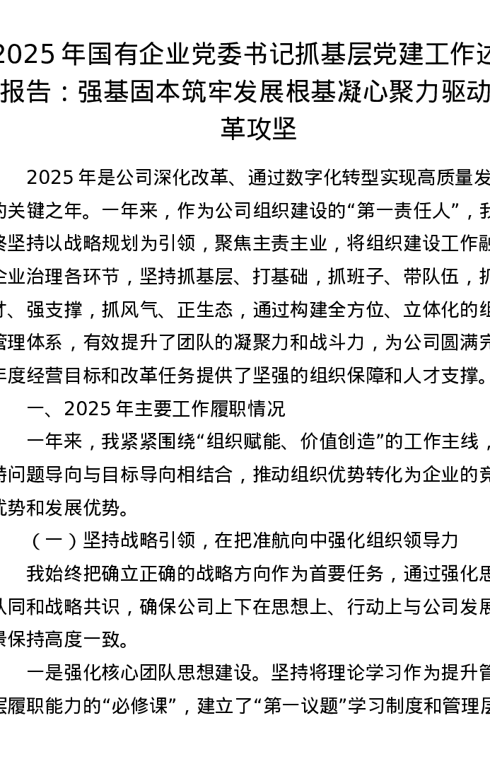 2025年国有企业党委书记抓基层党建工作述职报告:强基固本筑牢发展根基 凝心聚力驱动改革攻坚