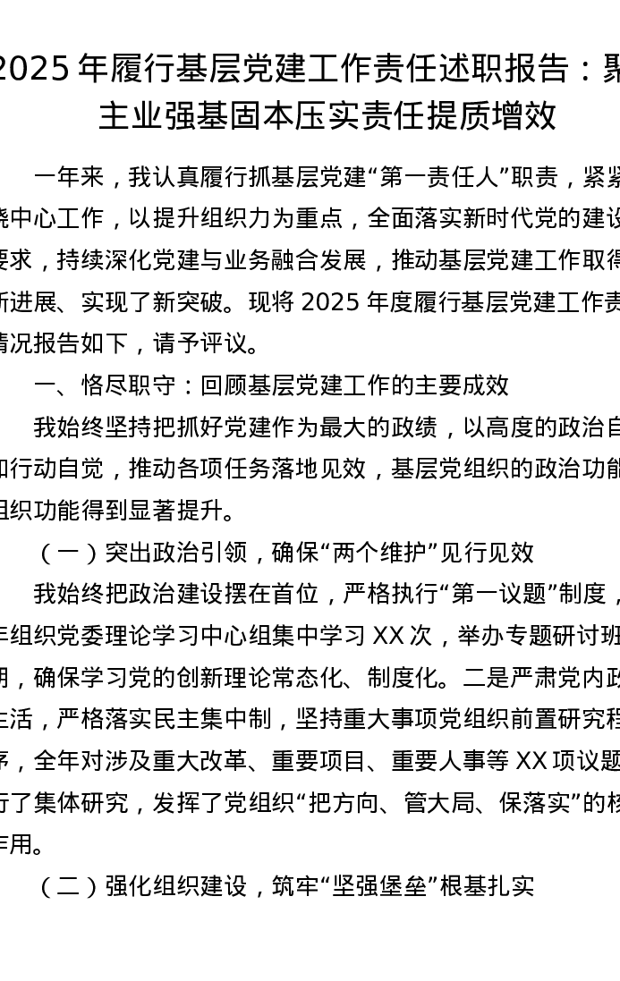 2025年履行基层党建工作责任述职报告:聚焦主业强基固本 压实责任提质增效