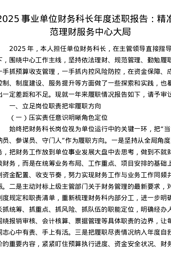 2025事业单位财务科长年度述职报告:精准规范理财 服务中心大局