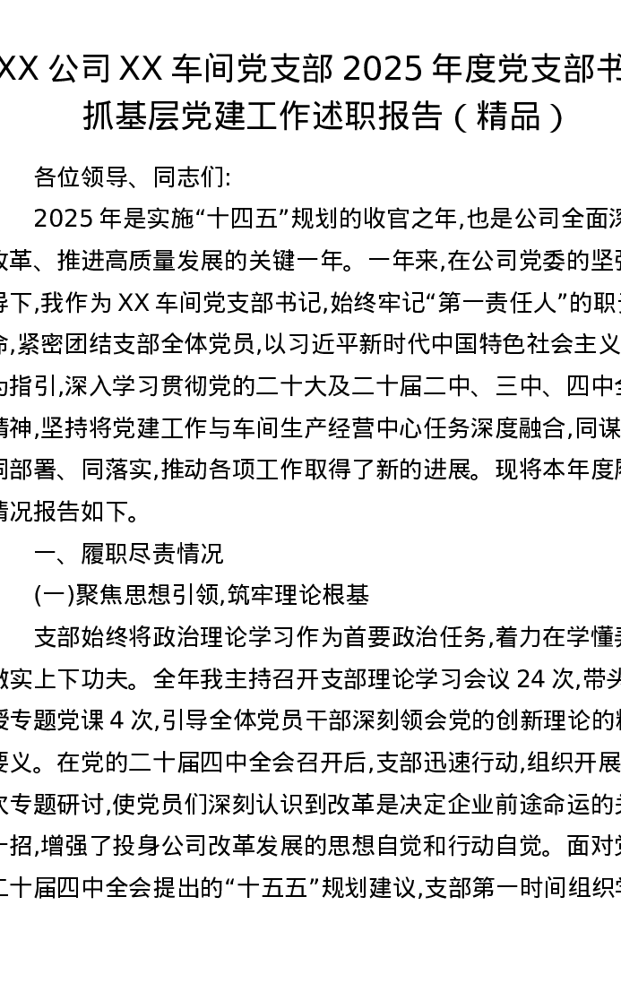 XX公司XX车间党支部2025年度党支部书记抓基层党建工作述职报告