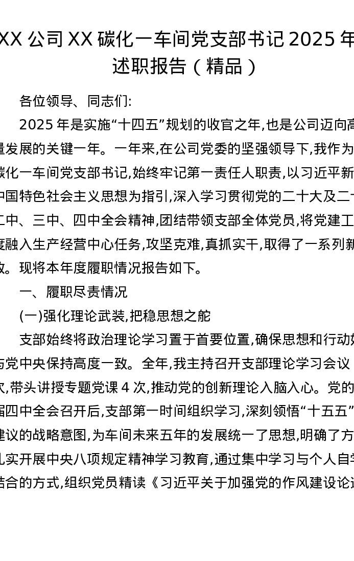 XX公司XX碳化一车间党支部书记2025年度述职报告