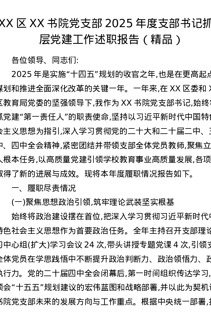 XX区XX书院党支部2025年度支部书记抓基层党建工作述职报告
