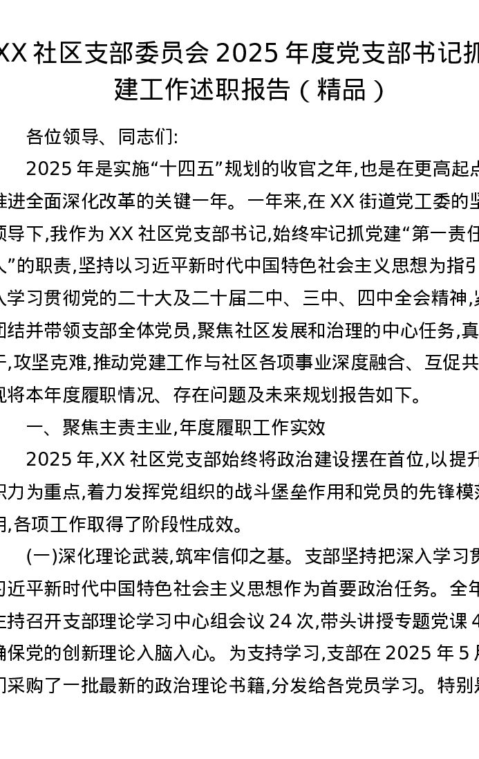XX社区支部委员会2025年度党支部书记抓党建工作述职报告