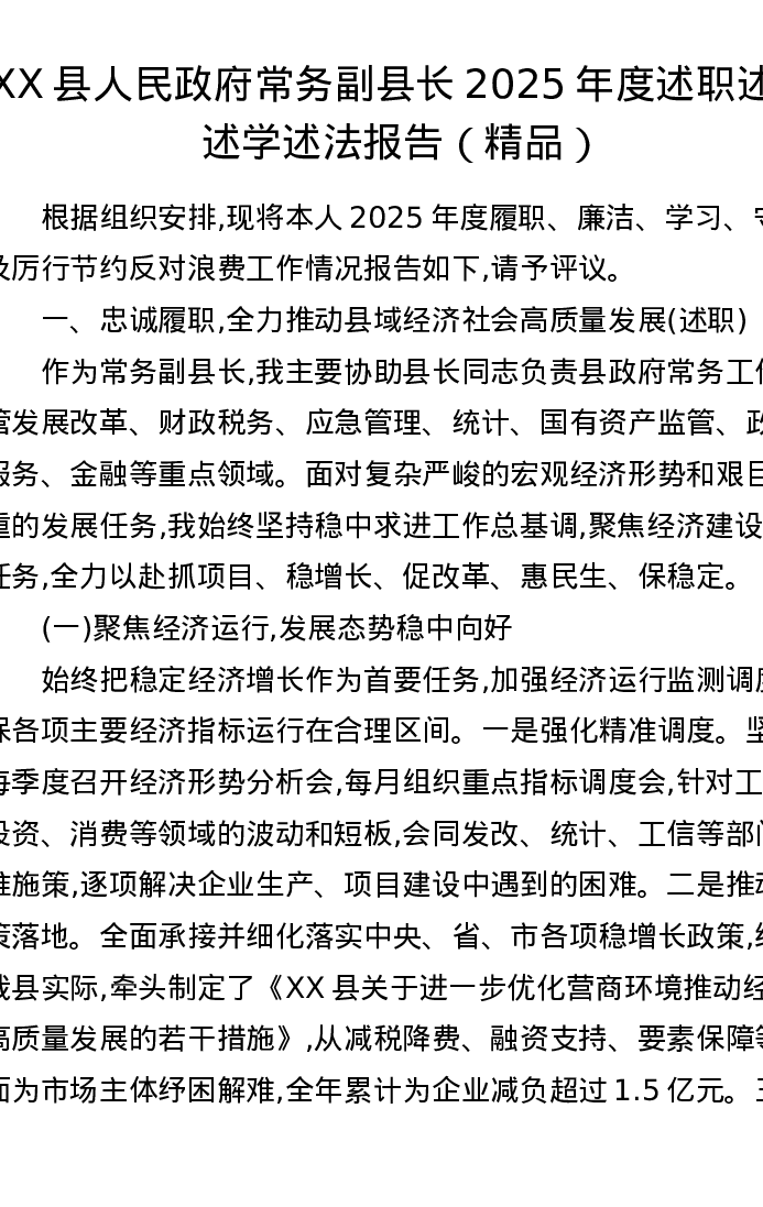 XX县人民政府常务副县长2025年度述职述廉述学述法报告