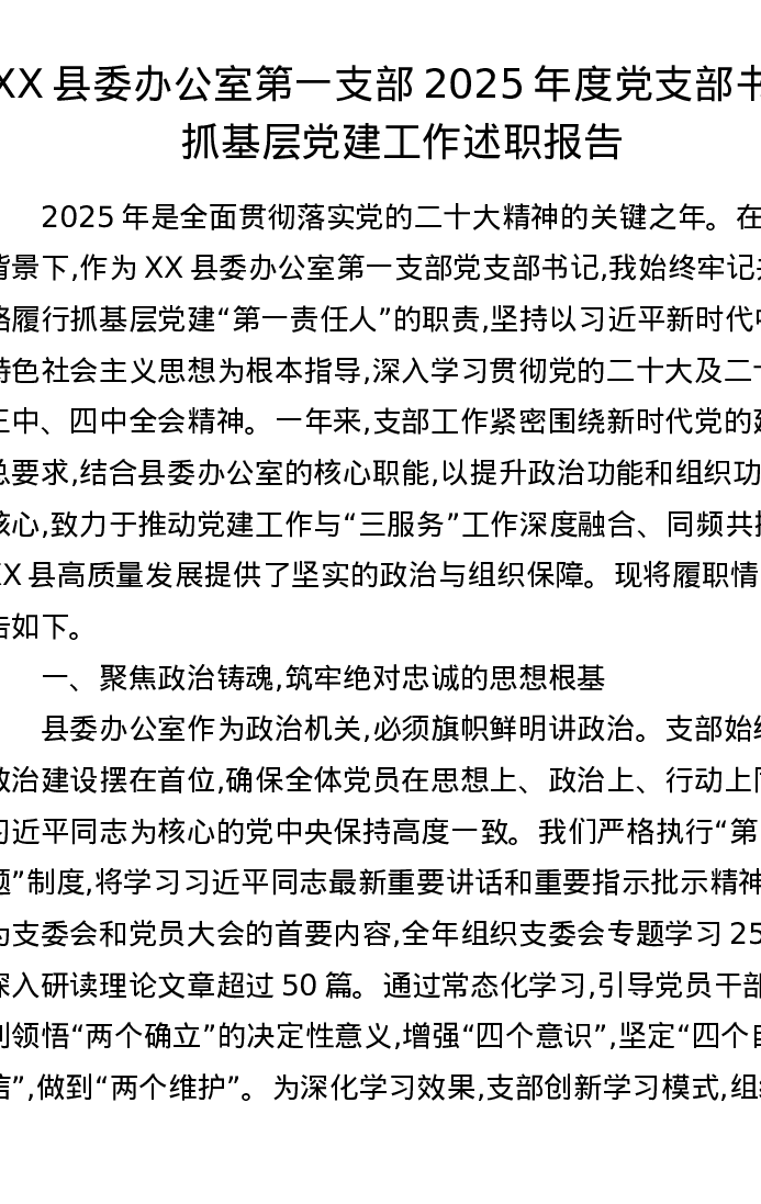 XX县委办公室第一支部2025年度党支部书记抓基层党建工作述职报告 ○