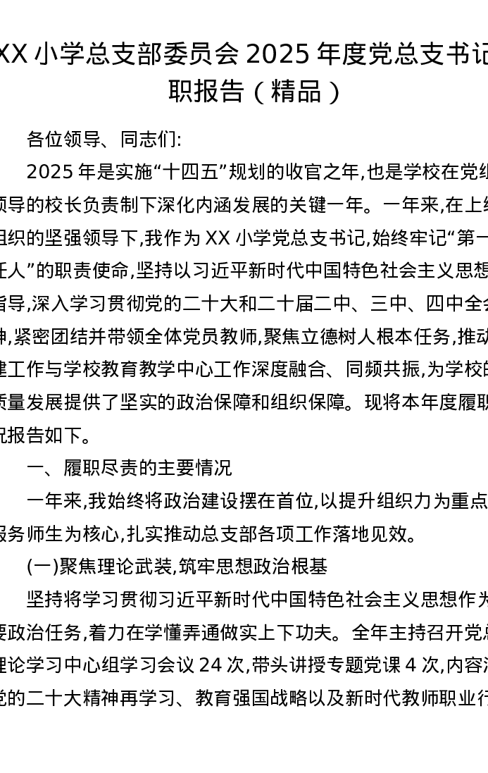 XX小学总支部委员会2025年度党总支书记述职报告
