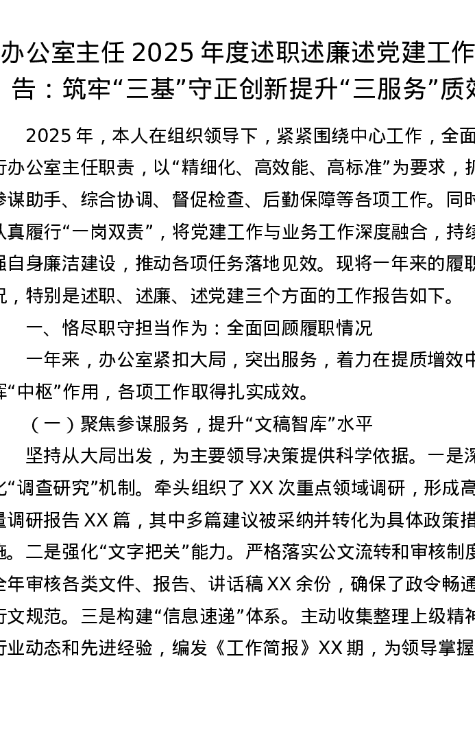 办公室主任2025年度述职述廉述党建工作报告:筑牢“三基”守正创新 提升“三服务”质效