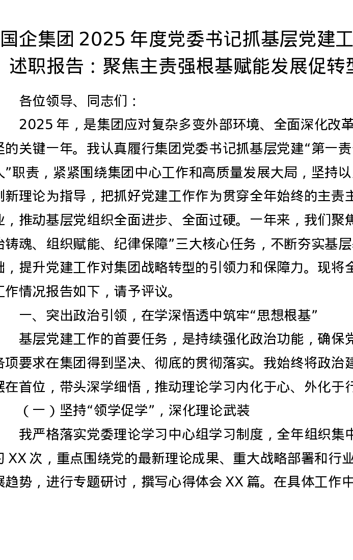 国企集团2025年度党委书记抓基层党建工作述职报告:聚焦主责强根基 赋能发展促转型