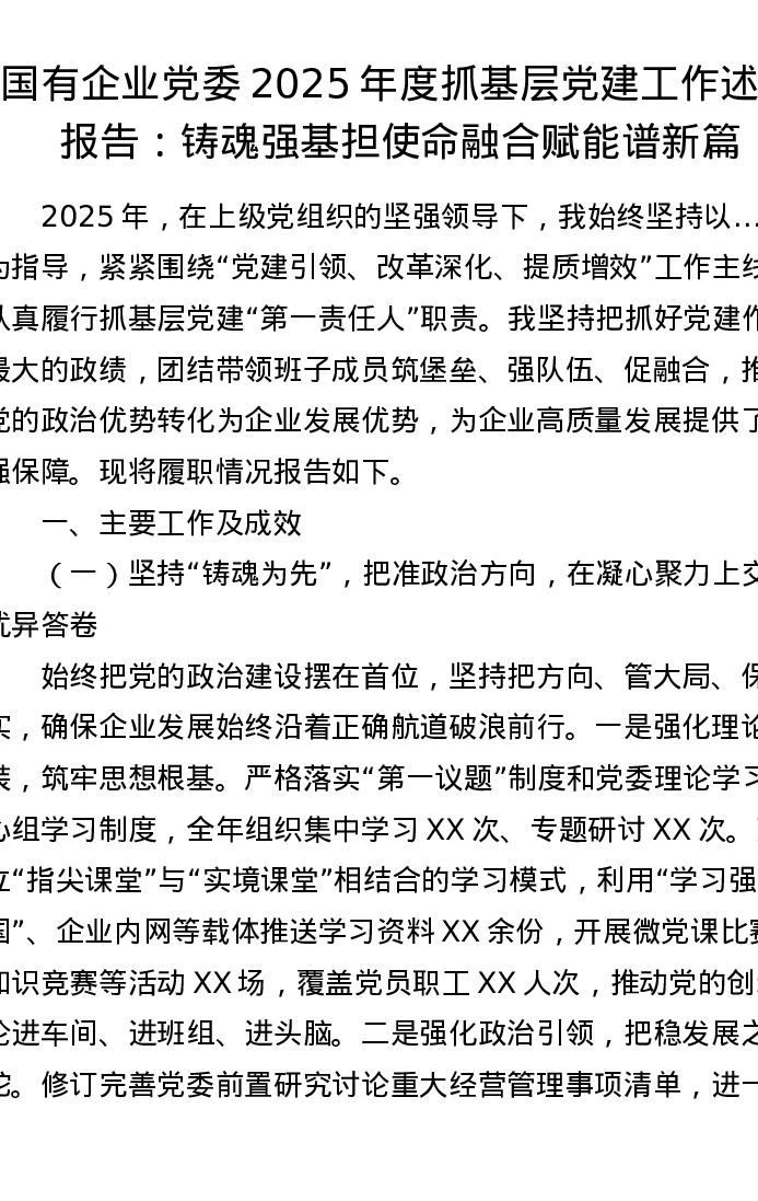 国有企业党委2025年度抓基层党建工作述职报告:铸魂强基担使命 融合赋能谱新篇