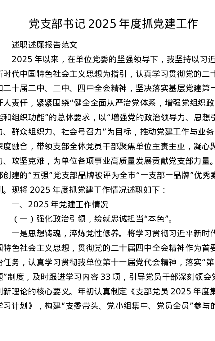 基层党支部书记2025年度抓党建工作述职述廉报告