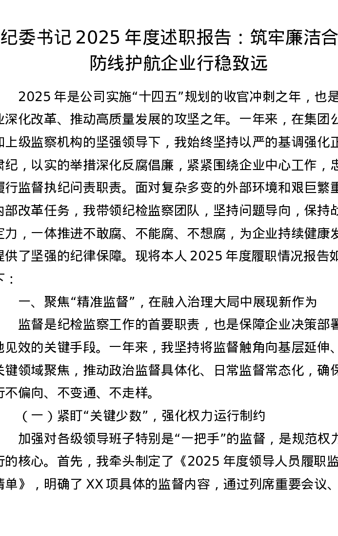 纪委书记2025年度述职报告:筑牢廉洁合规防线 护航企业行稳致远