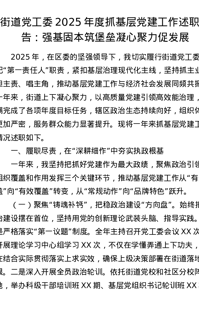 街道党工委2025年度抓基层党建工作述职报告:强基固本筑堡垒 凝心聚力促发展
