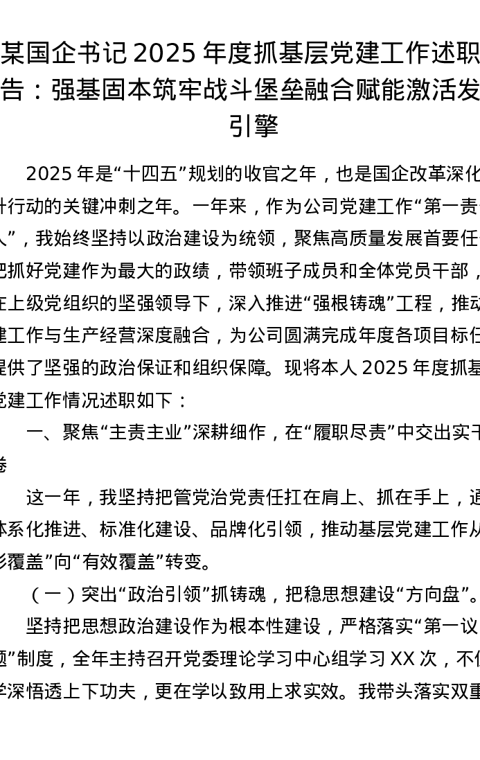 某国企书记2025年度抓基层党建工作述职报告:强基固本筑牢战斗堡垒 融合赋能激活发展引擎
