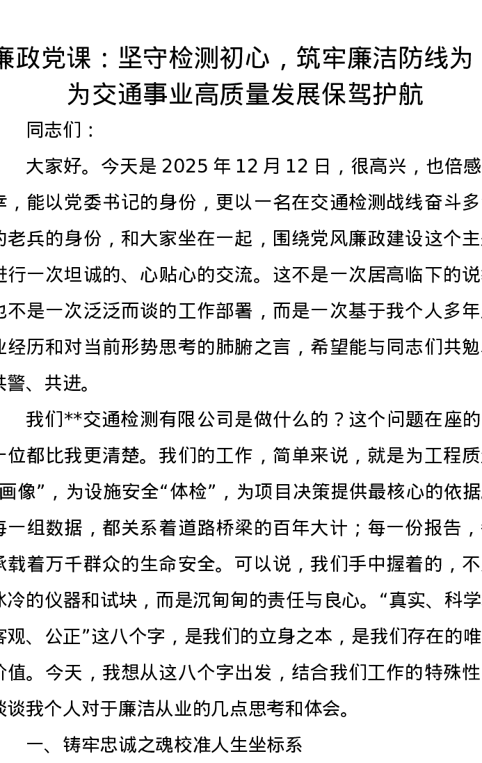 廉政党课讲稿:坚守检测初心,筑牢廉洁防线为,为交通事业高质量发展保驾护航
