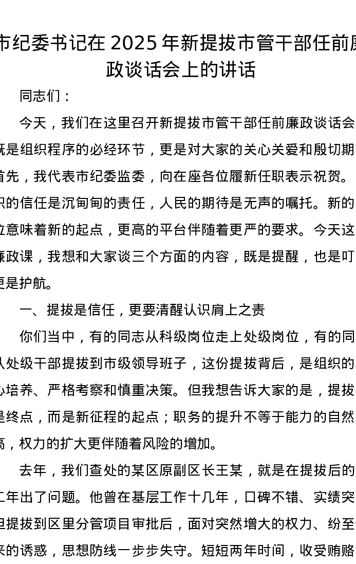 市纪委书记在2025年新提拔市管干部任前廉政谈话会上的讲话