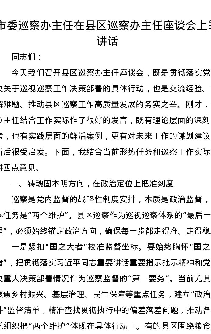 市委巡察办主任在县区巡察办主任座谈会上的讲话