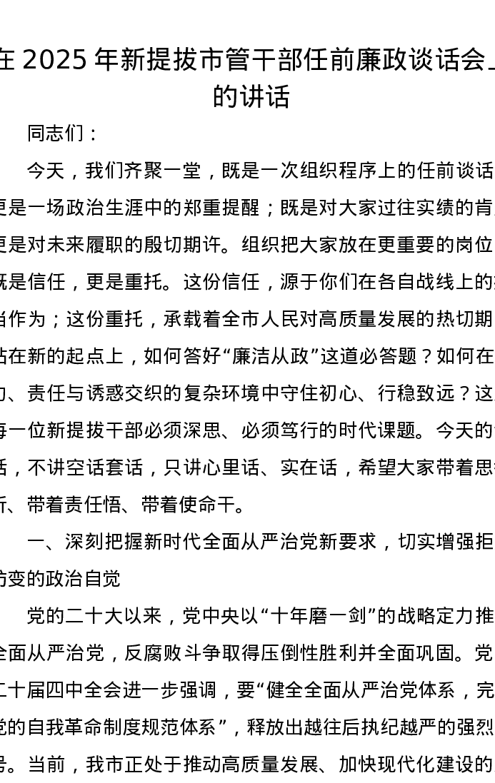 在2025年新提拔市管干部任前廉政谈话会上的讲话