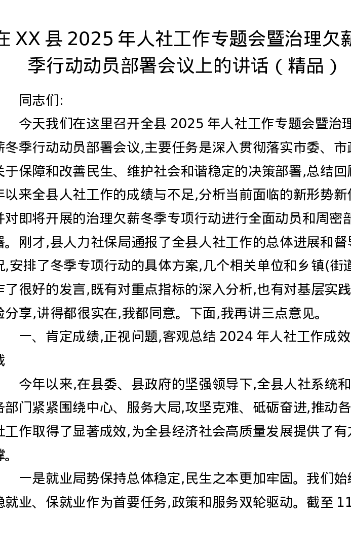 在XX县2025年人社工作专题会暨治理欠薪冬季行动动员部署会议上的讲话