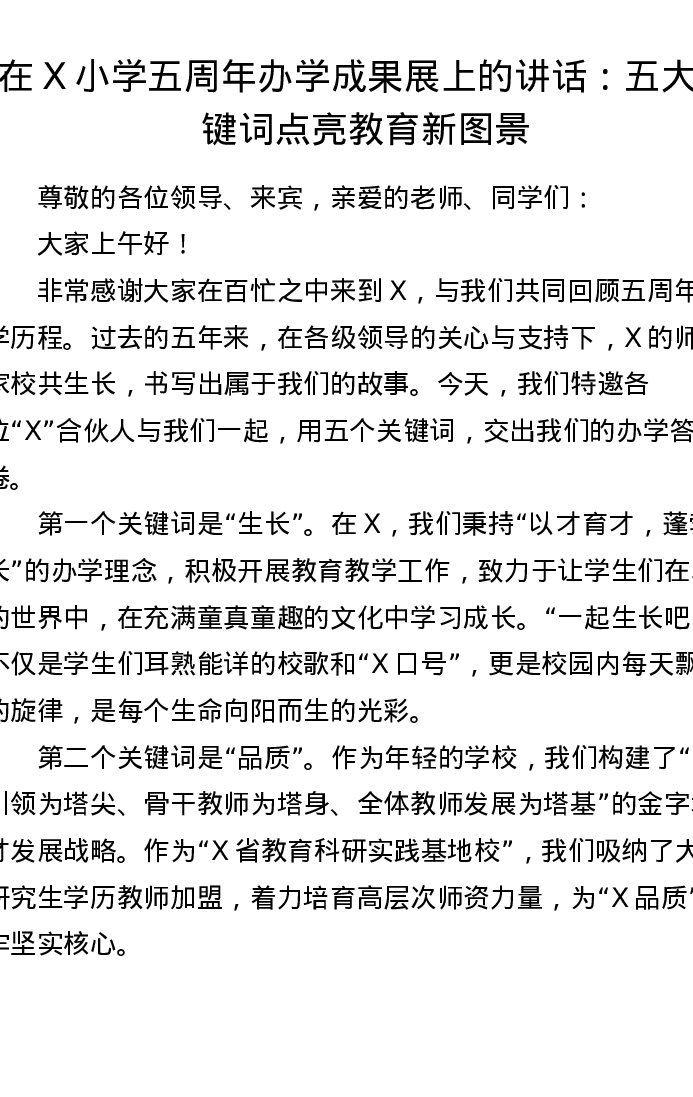 在X小学五周年办学成果展上的讲话:五大关键词点亮教育新图景