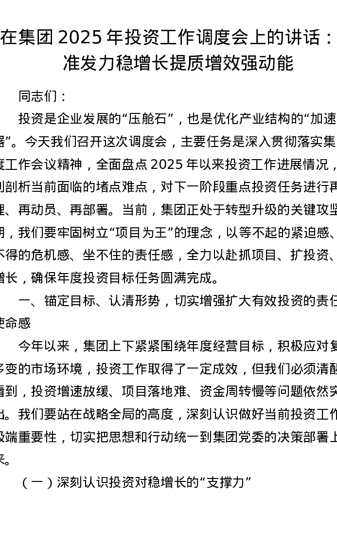 在集团2025年投资工作调度会上的讲话:精准发力稳增长 提质增效强动能