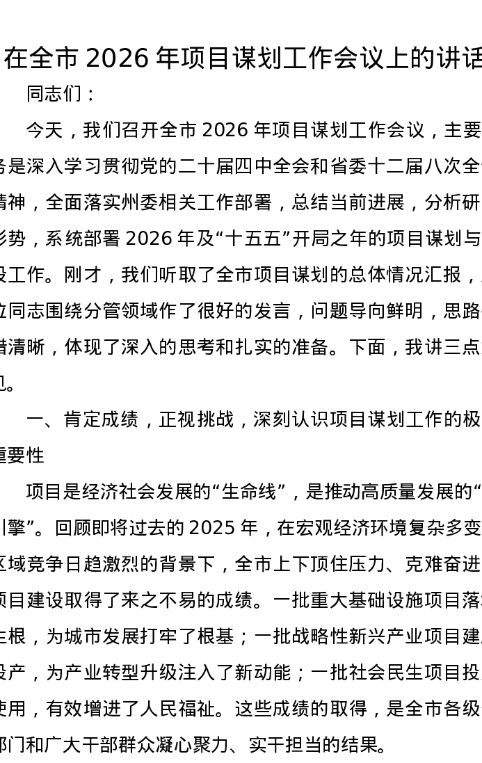在全市2026年项目谋划工作会议上的讲话