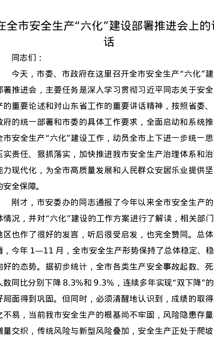 在全市安全生产“六化”建设部署推进会上的讲话