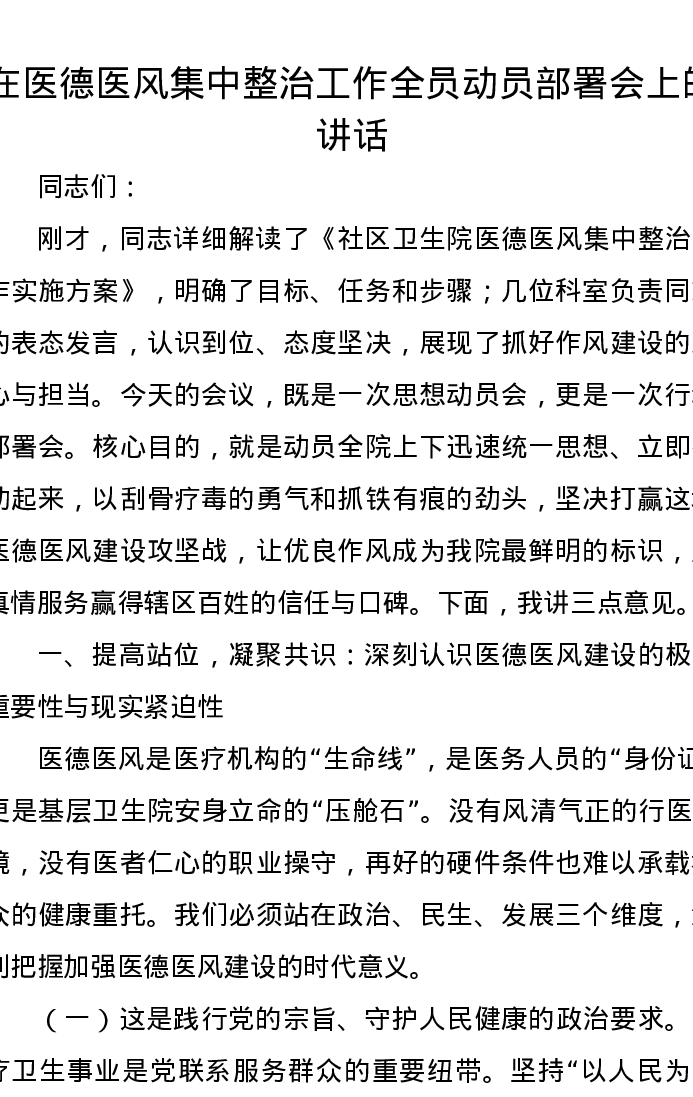在医德医风集中整治工作全员动员部署会上的讲话
