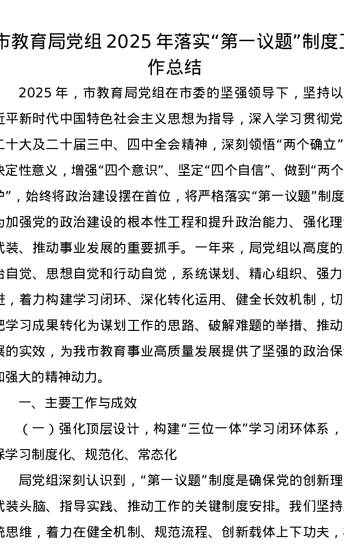 市教育局党组2025年落实“第一议题”制度工作总结