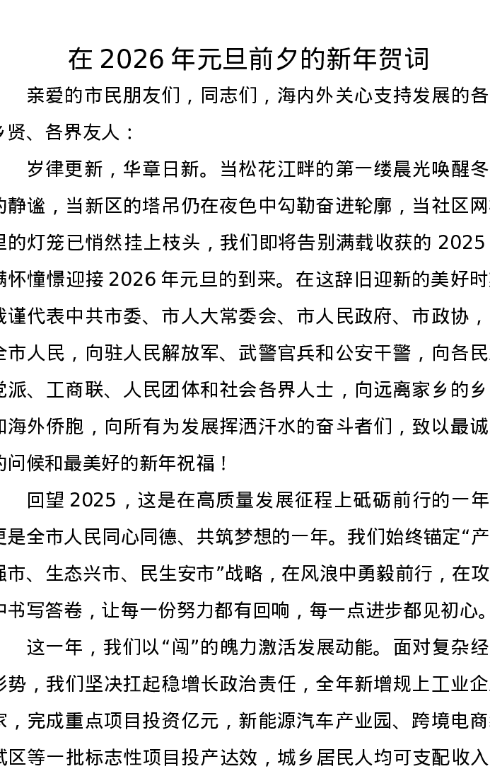 在2026年元旦前夕的新年贺词