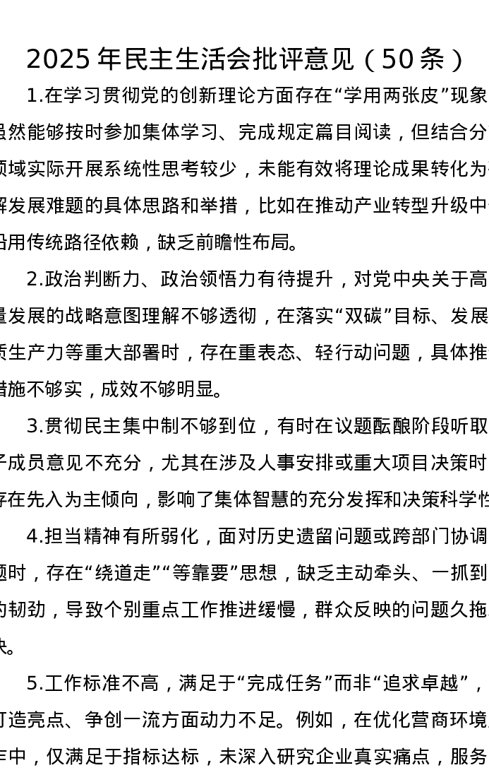 2025年民主生活会批评意见(50条)