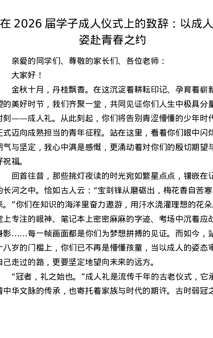 在2026届学子成人仪式上的致辞:以成人之姿赴青春之约