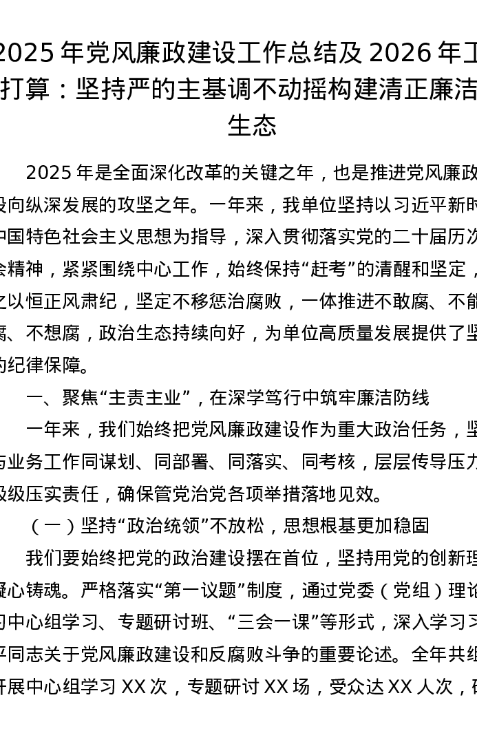 2025年党风廉政建设工作总结及2026年工作打算:坚持严的主基调不动摇 构建清正廉洁新生态