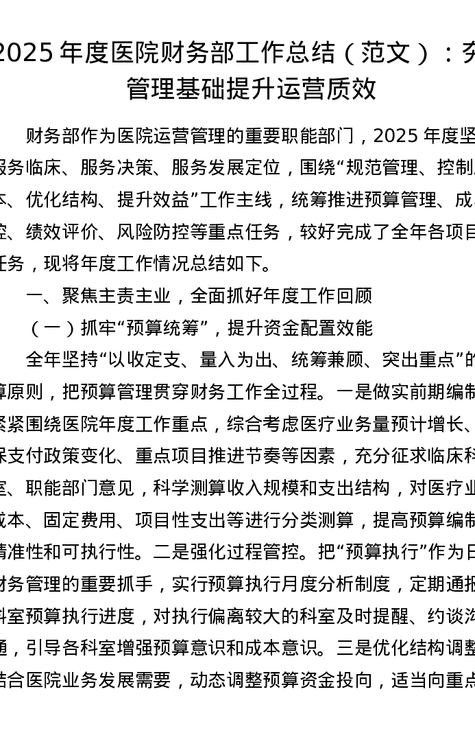 2025年度医院财务部工作总结(范文):夯实管理基础 提升运营质效