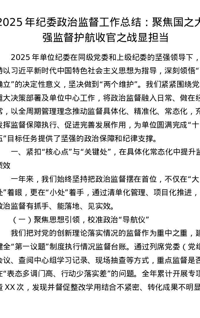 2025年纪委政治监督工作总结:聚焦国之大者强监督 护航收官之战显担当