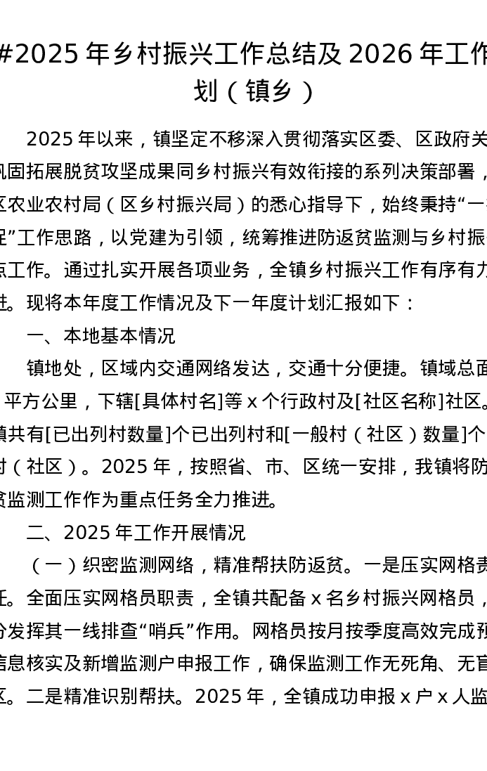 2025年乡村振兴工作总结及2026年工作计划(镇乡)