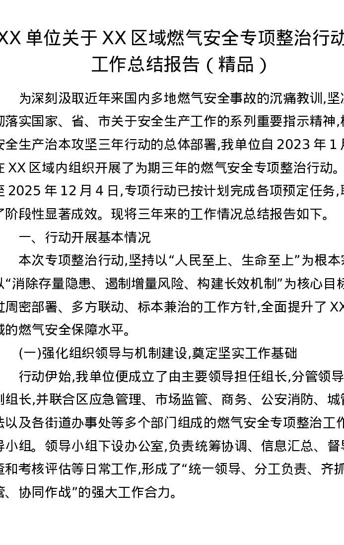 XX单位关于XX区域燃气安全专项整治行动的工作总结报告