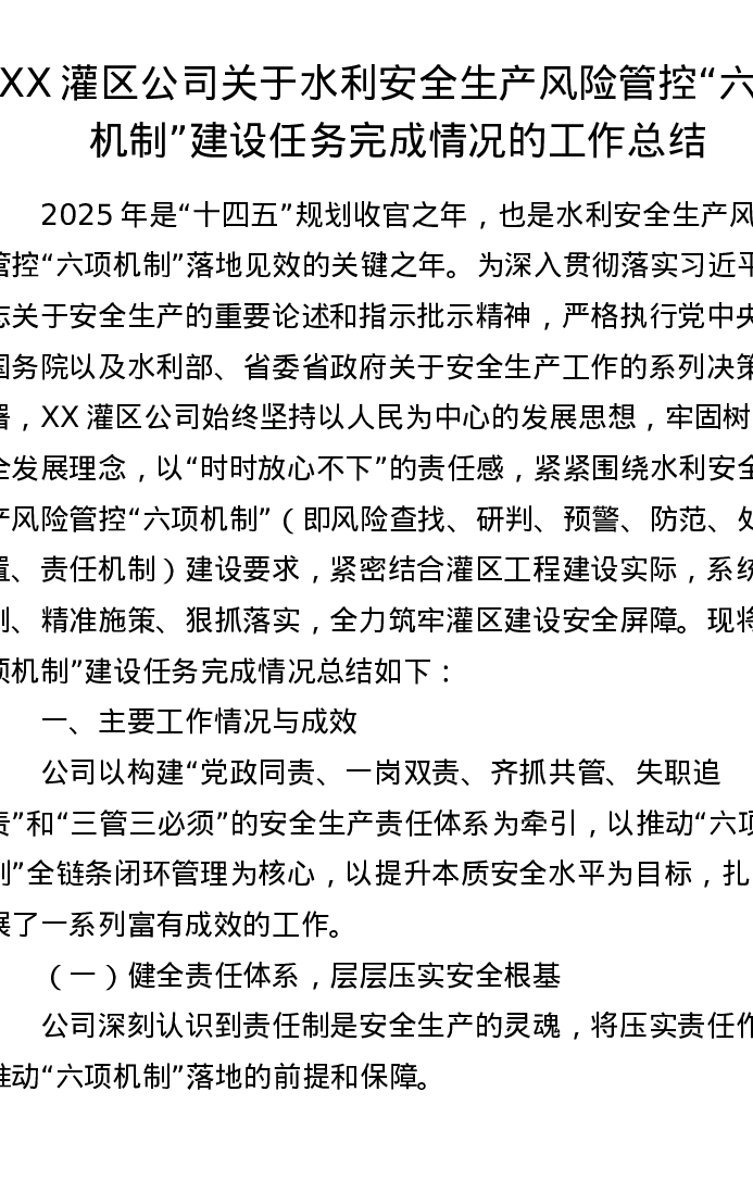 XX灌区公司关于水利安全生产风险管控“六项机制”建设任务完成情况的工作总结