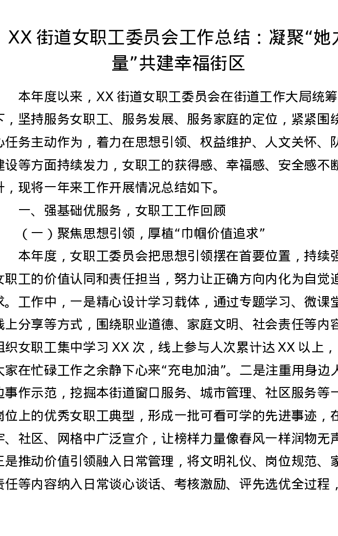 XX街道女职工委员会工作总结:凝聚“她力量”共建幸福街区