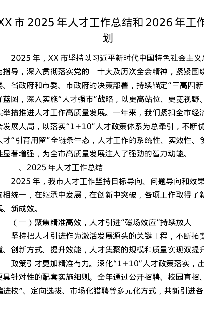 XX市2025年人才工作总结和2026年工作计划(5223字)