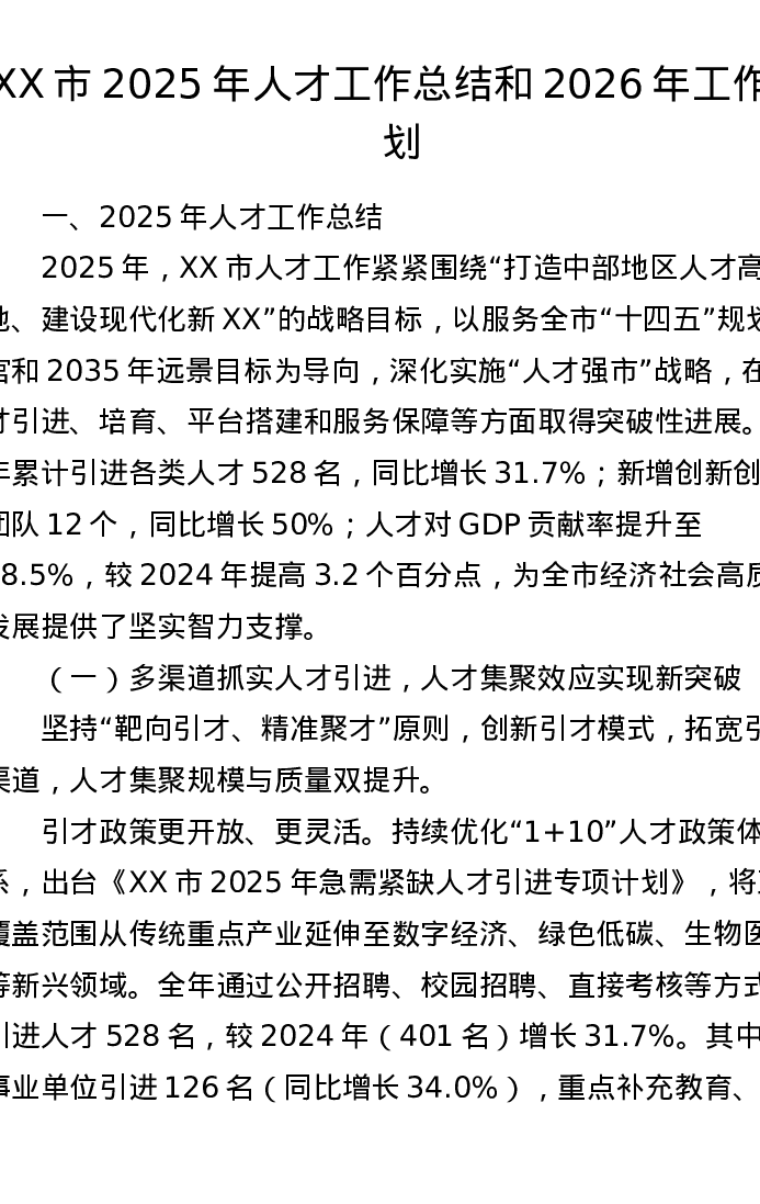 XX市2025年人才工作总结和2026年工作计划(6555字)