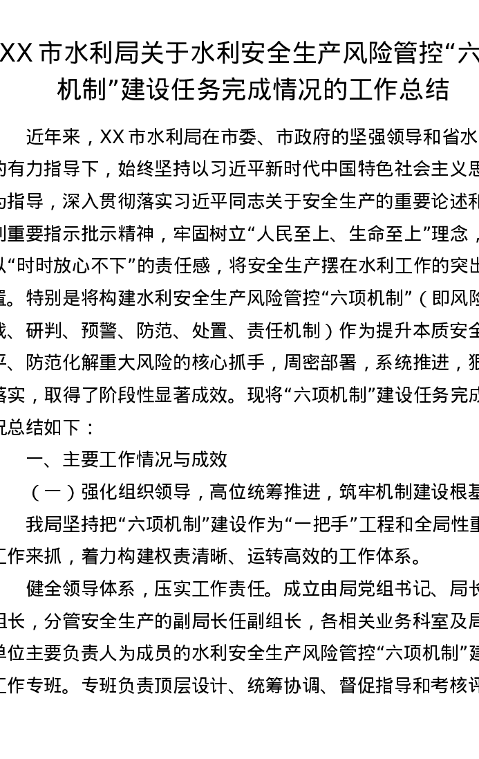 XX市水利局关于水利安全生产风险管控“六项机制”建设任务完成情况的工作总结(4996字)