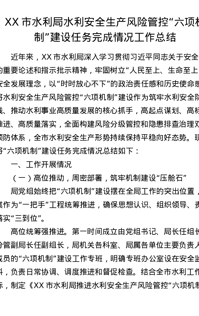XX市水利局水利安全生产风险管控“六项机制”建设任务完成情况工作总结