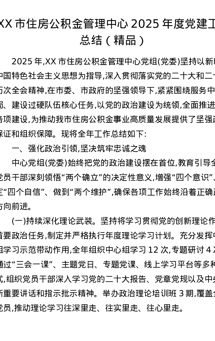 XX市住房公积金管理中心2025年度党建工作总结