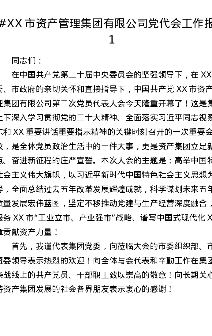 XX市资产管理集团有限公司党代会工作报告1