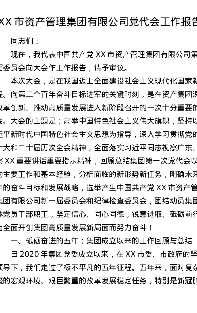 XX市资产管理集团有限公司党代会工作报告2