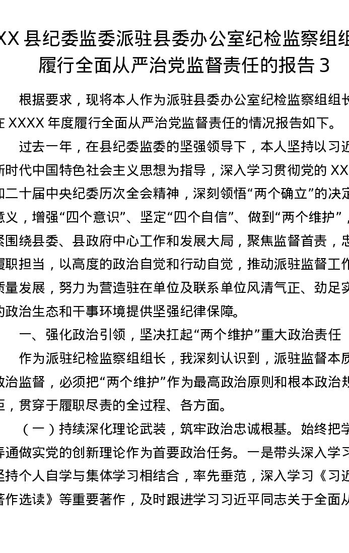 XX县纪委监委派驻县委办公室纪检监察组组长履行全面从严治党监督责任的报告3