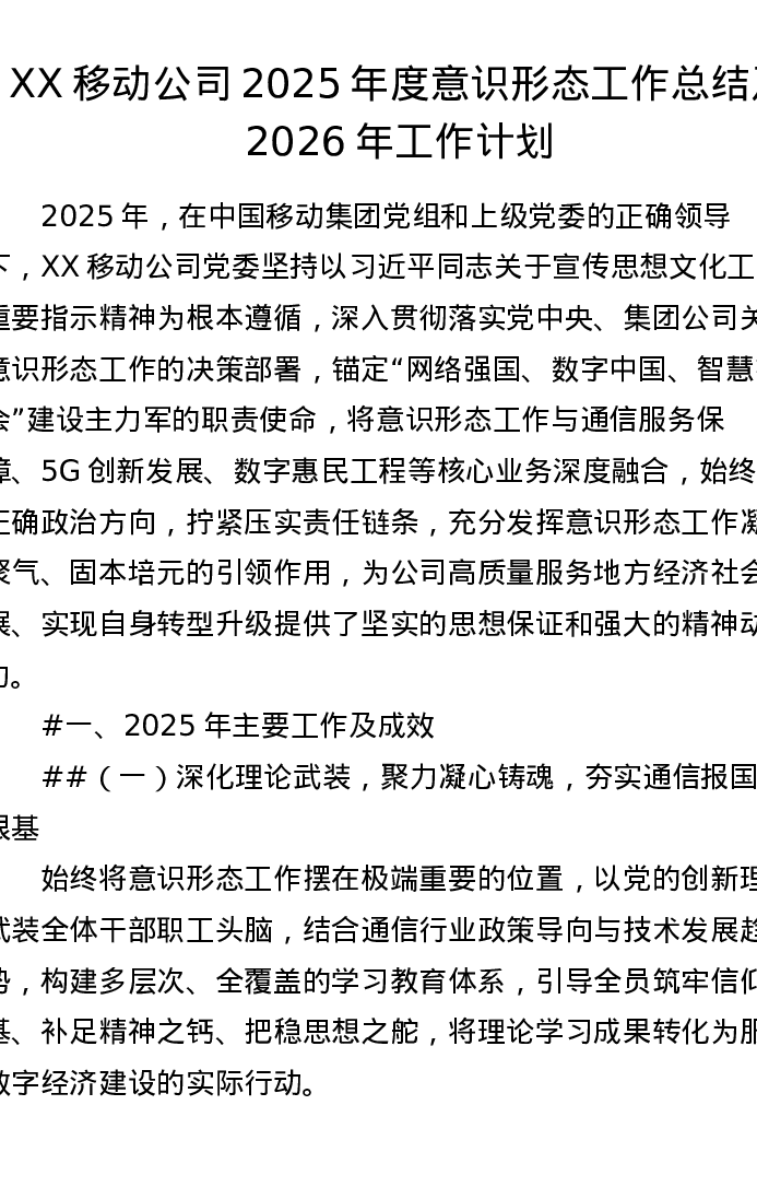 XX移动公司2025年度意识形态工作总结及2026年工作计划(7740字)